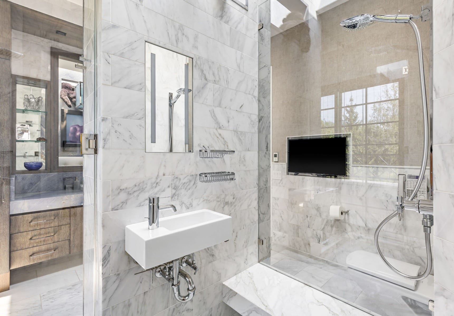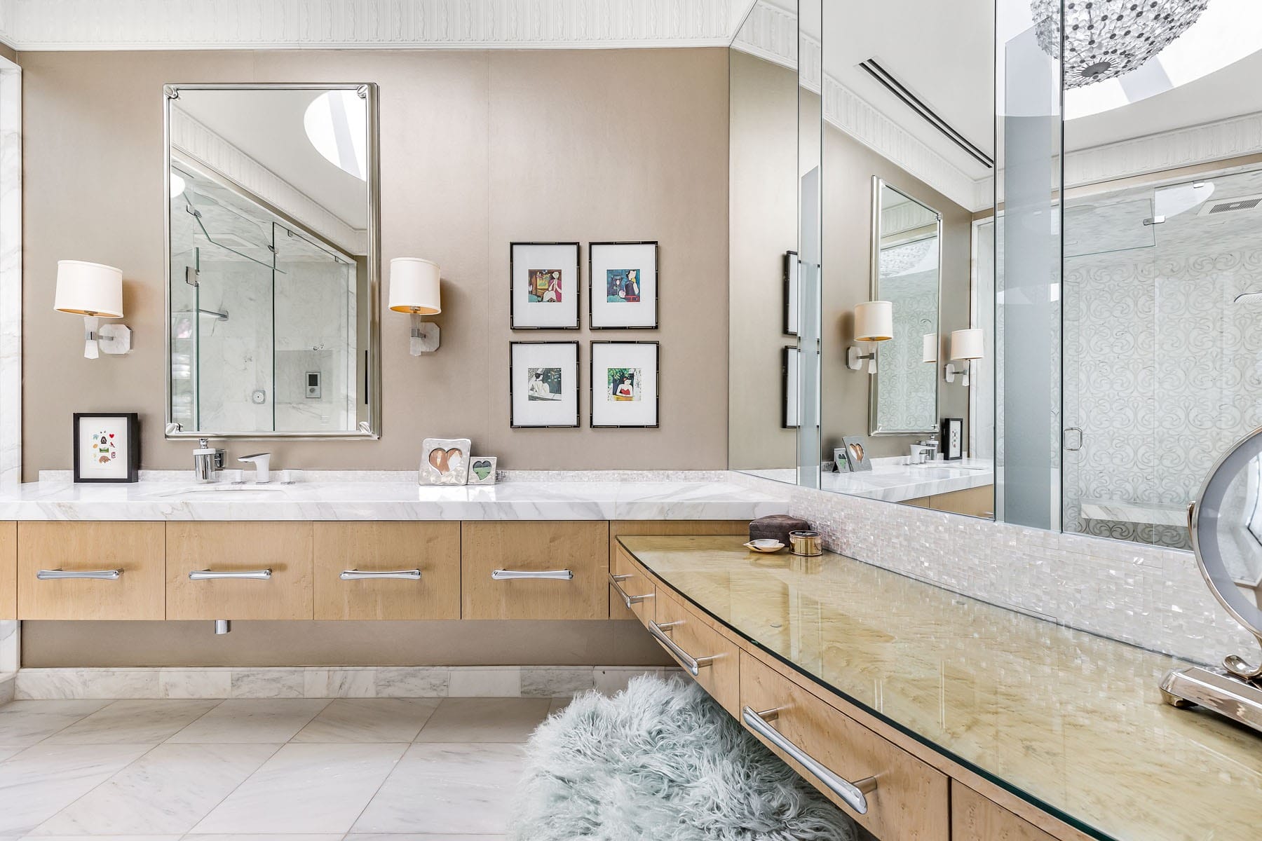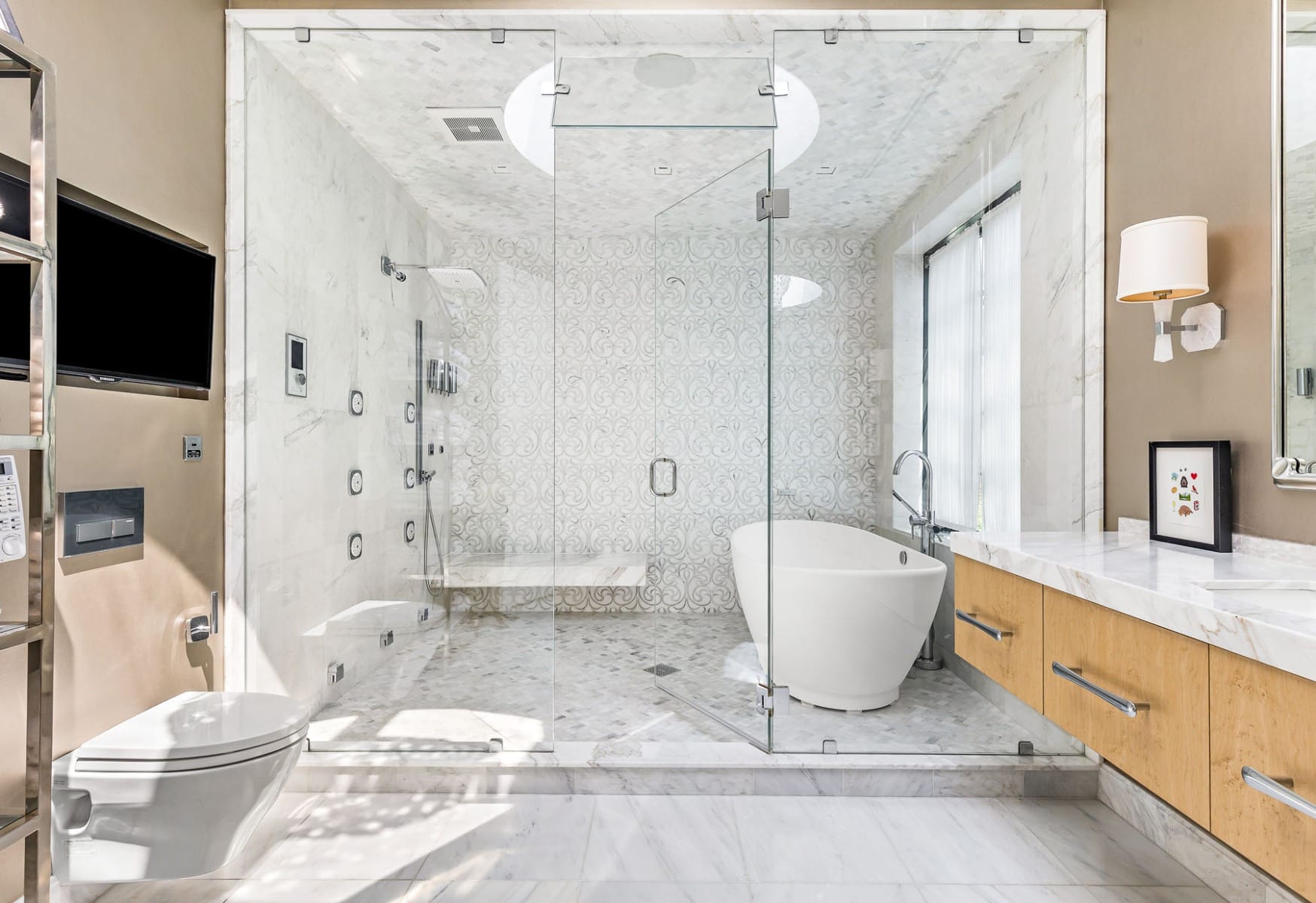 - Architectural Marvels: From the master bedroom balcony graced with a steel pergola to intricate design elements like floating vanities, circular bubble skylights, cerused wood cabinetry, and Calcutta marble accents, each corner of the estate exemplifies craftsmanship.