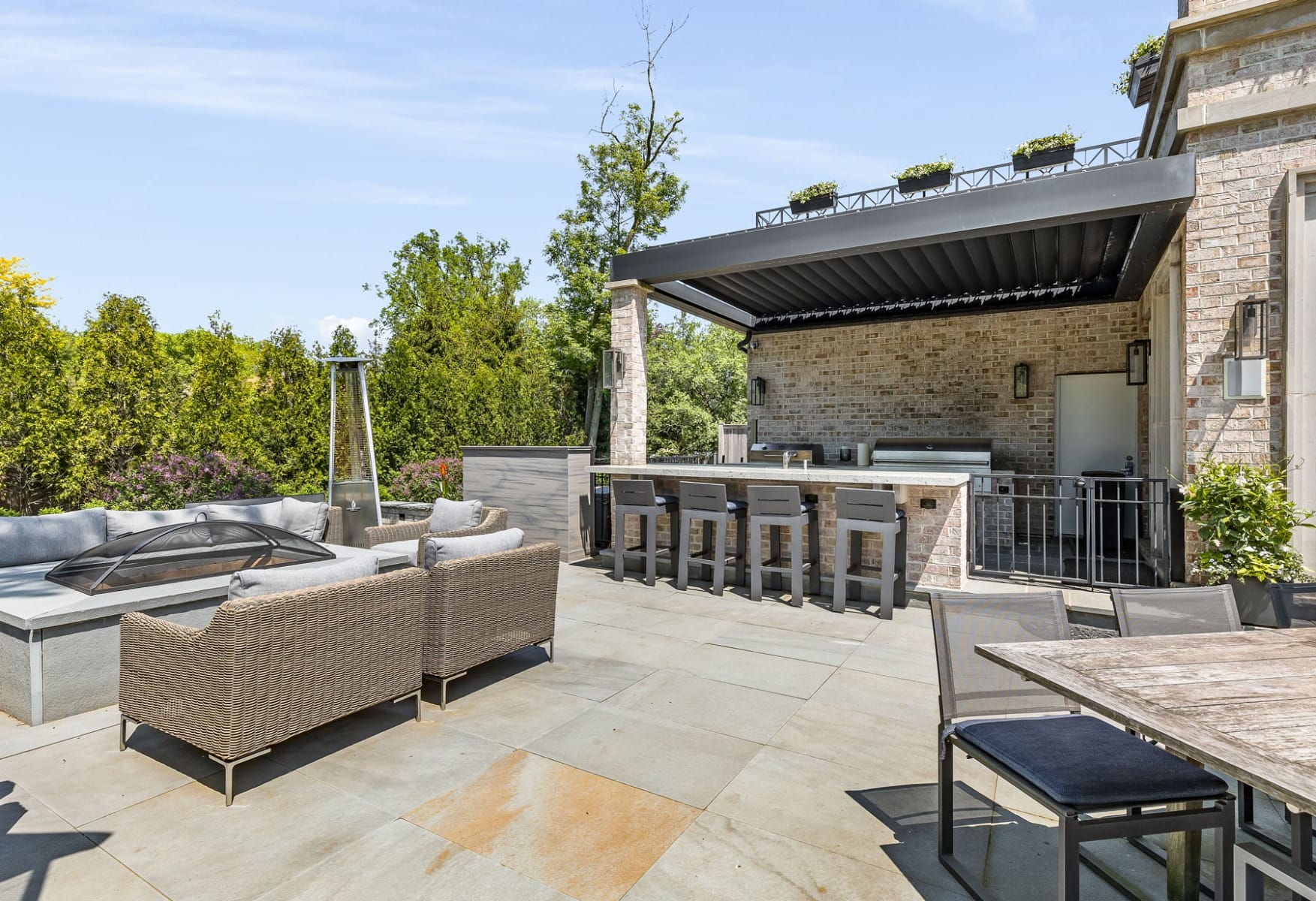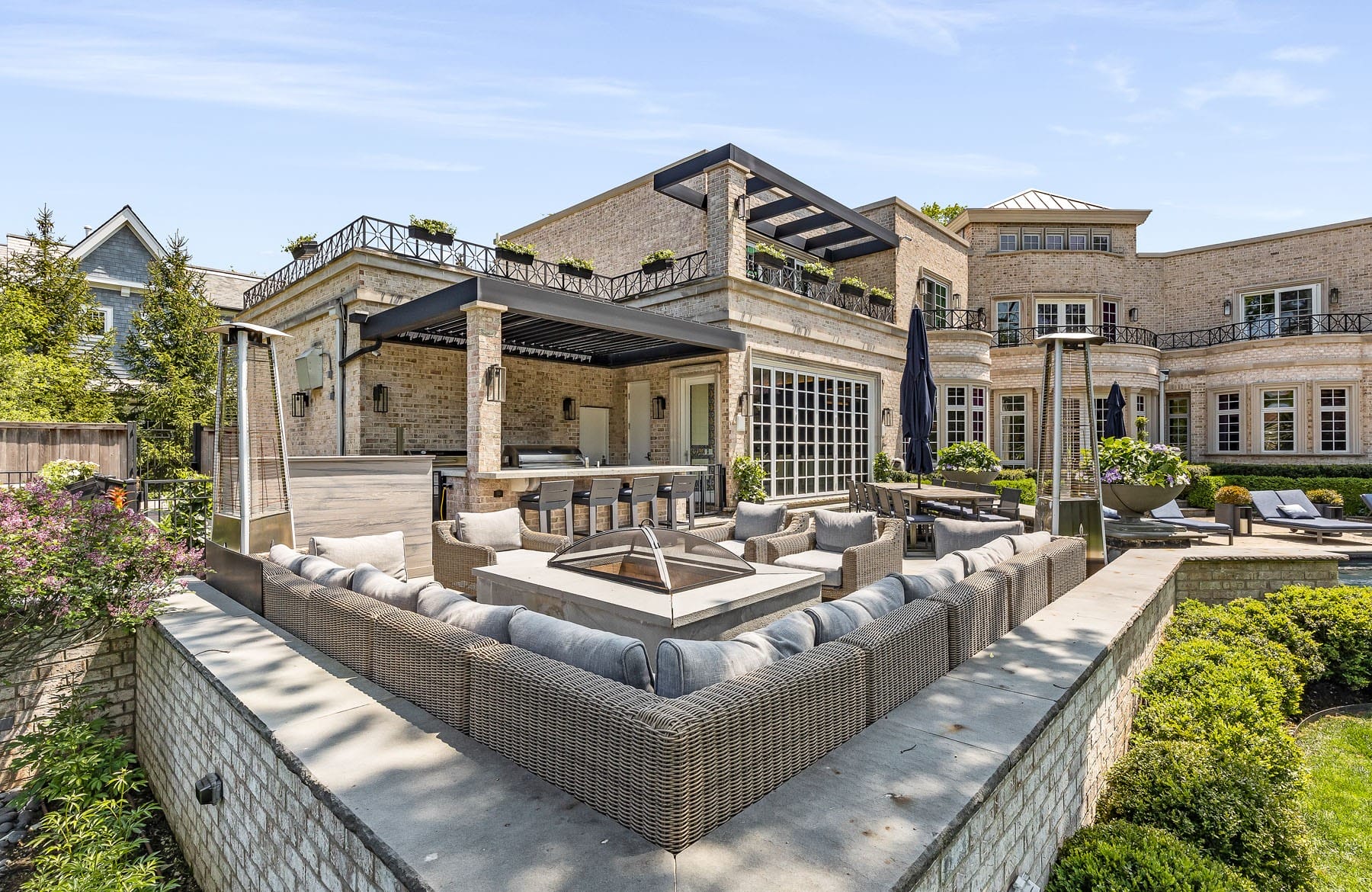 - Outdoor Elegance: The property’s rear reveals an exquisite outdoor expanse, complete with a terraced patio pool and a cooking zone crowned with a retractable sunroof. Additionally, the black-bottom pool adorned with a stone waterfall return emerges as a haven of tranquility.
