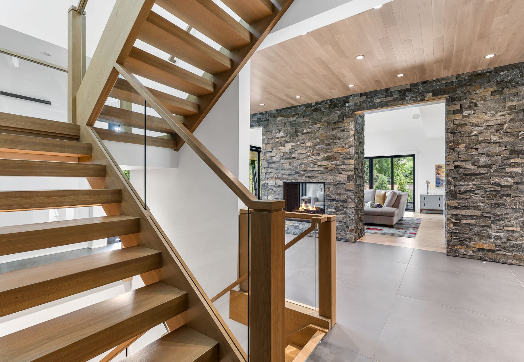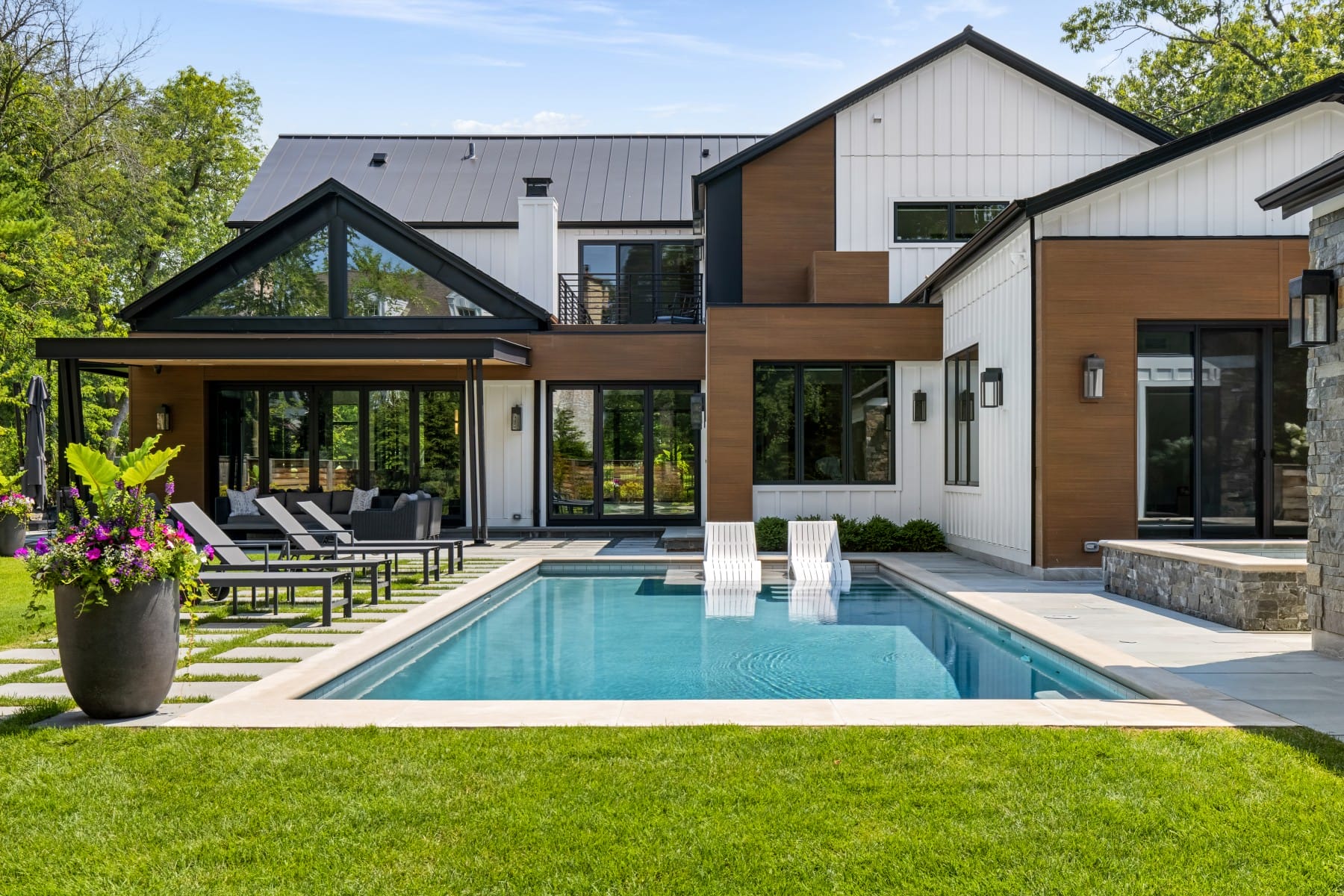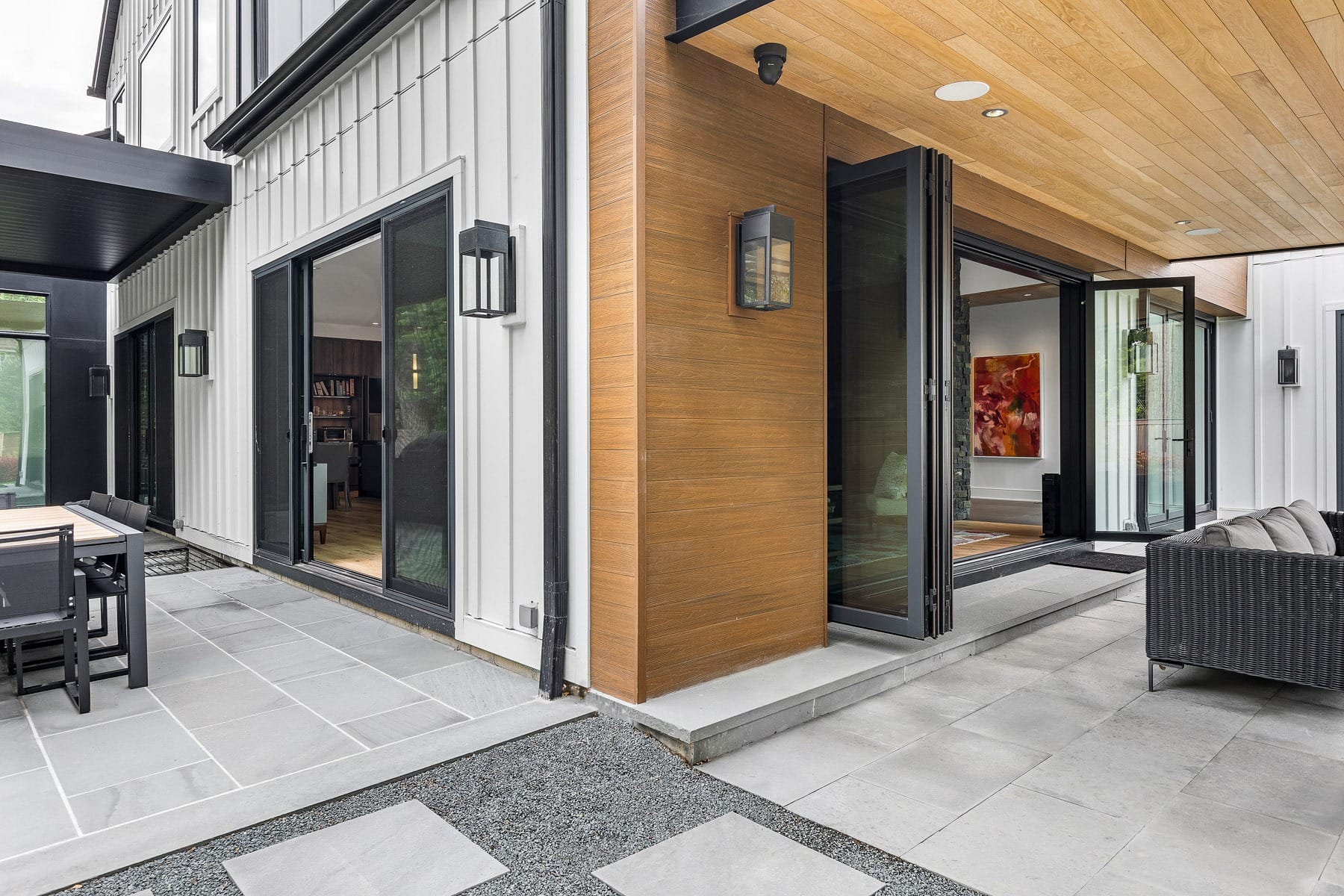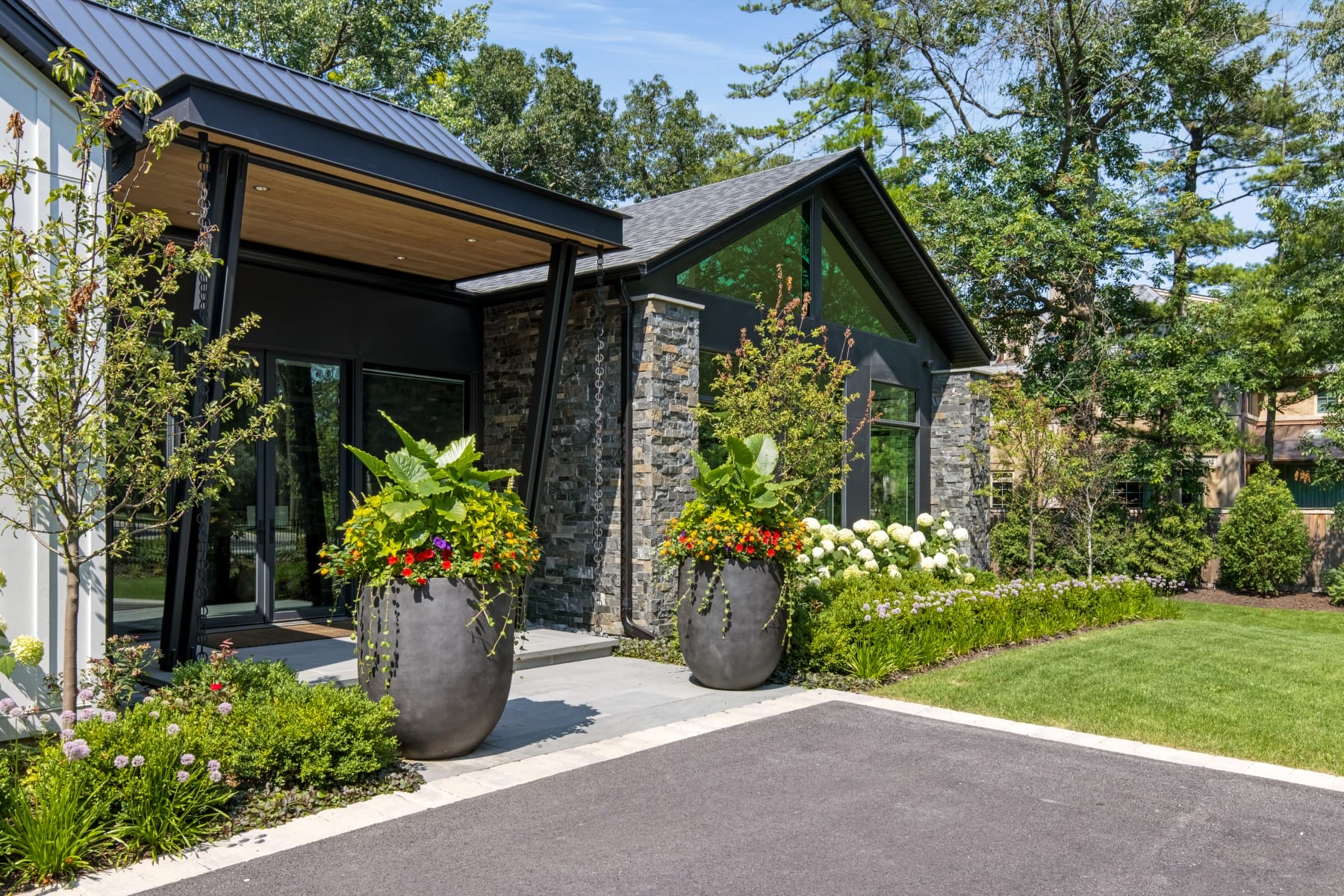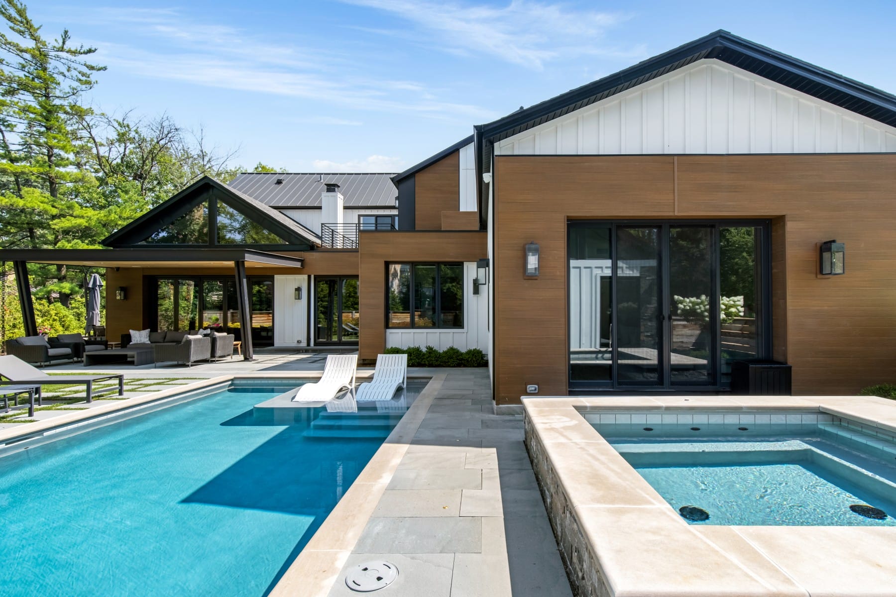 • Dynamic Exterior Design: Layering different exterior blends such as stone, metal panels, board and batten, rain screen composite wood sidings, and teak wood provides a fascinating visual depth to the structure. The incorporation of East Coast natural stone both outside and inside the home, alongside custom metal panels, seamlessly juxtaposes contemporary flair against traditional stone aesthetics.