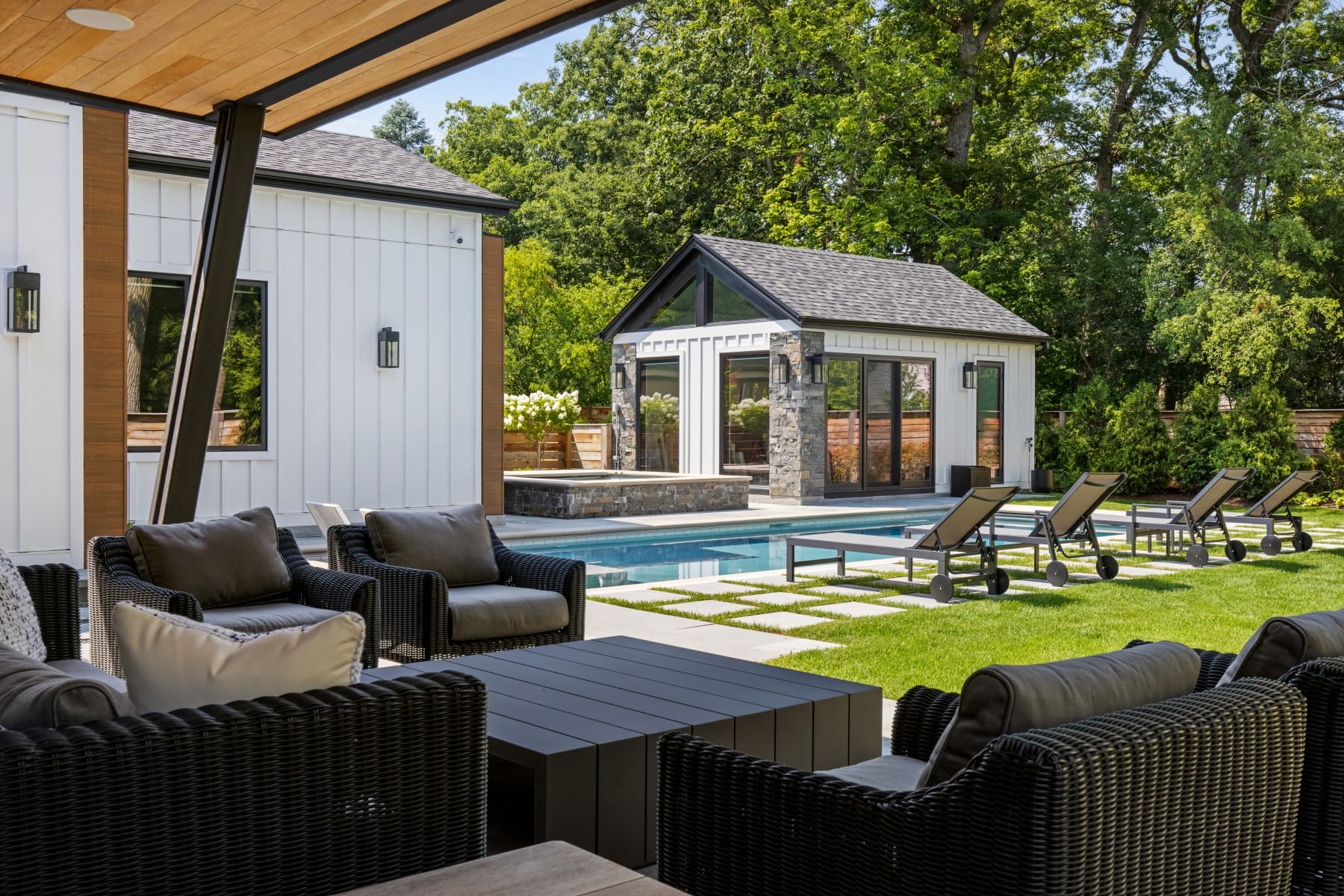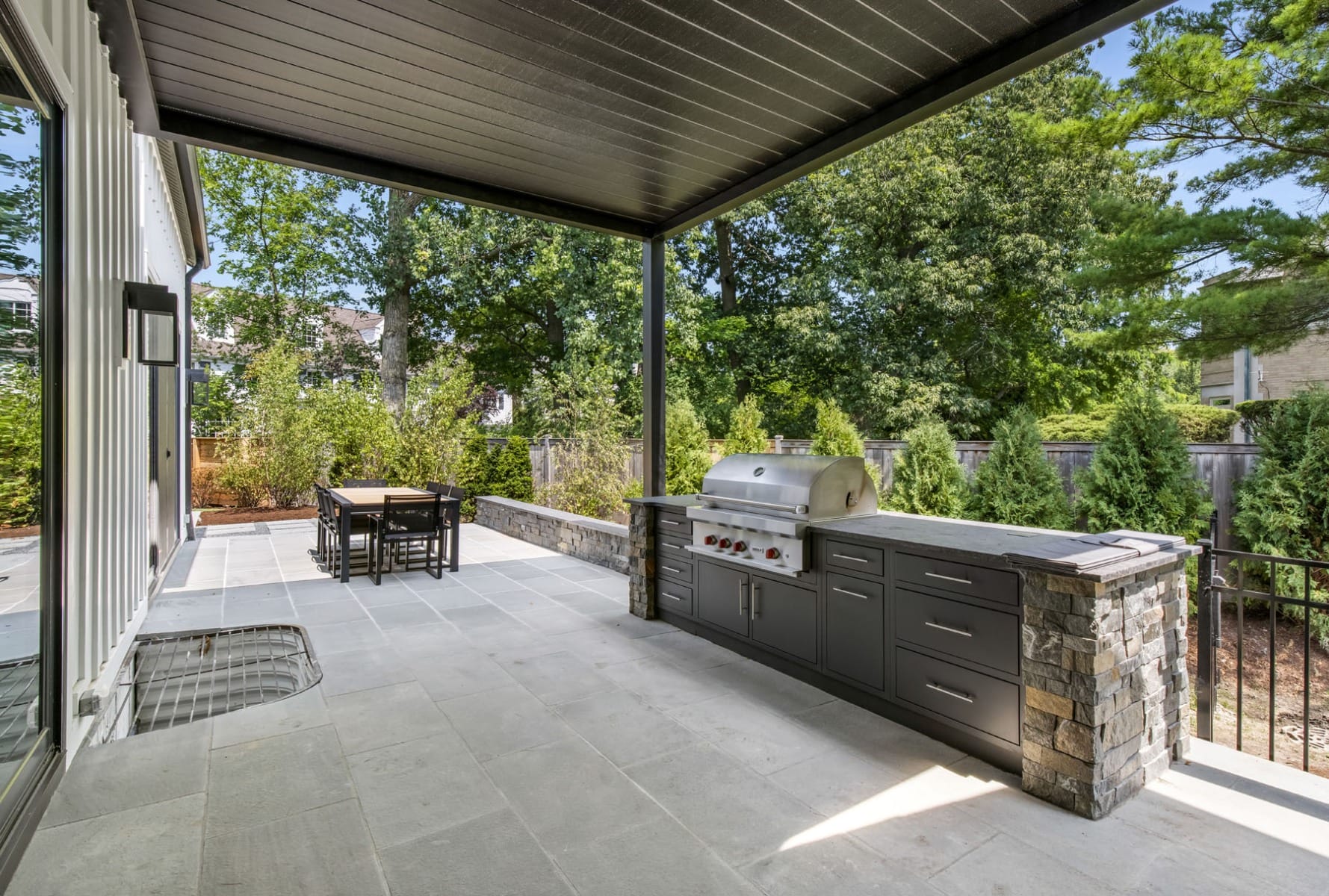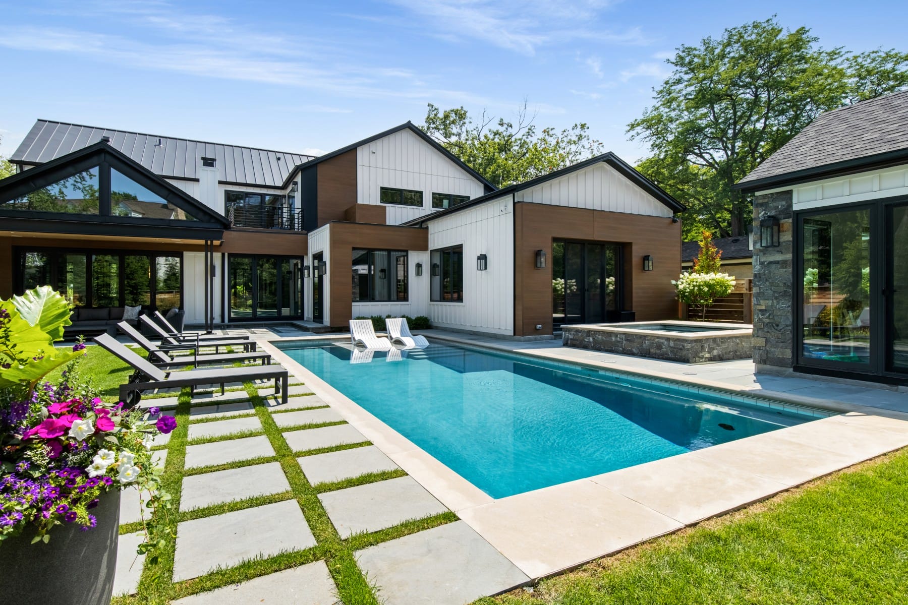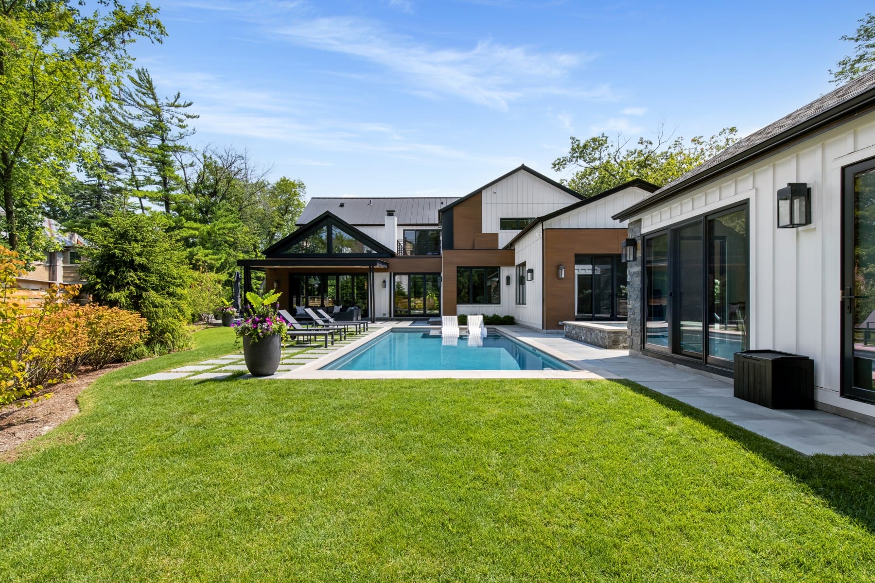 • Dynamic Exterior Design: Layering different exterior blends such as stone, metal panels, board and batten, rain screen composite wood sidings, and teak wood provides a fascinating visual depth to the structure. The incorporation of East Coast natural stone both outside and inside the home, alongside custom metal panels, seamlessly juxtaposes contemporary flair against traditional stone aesthetics.