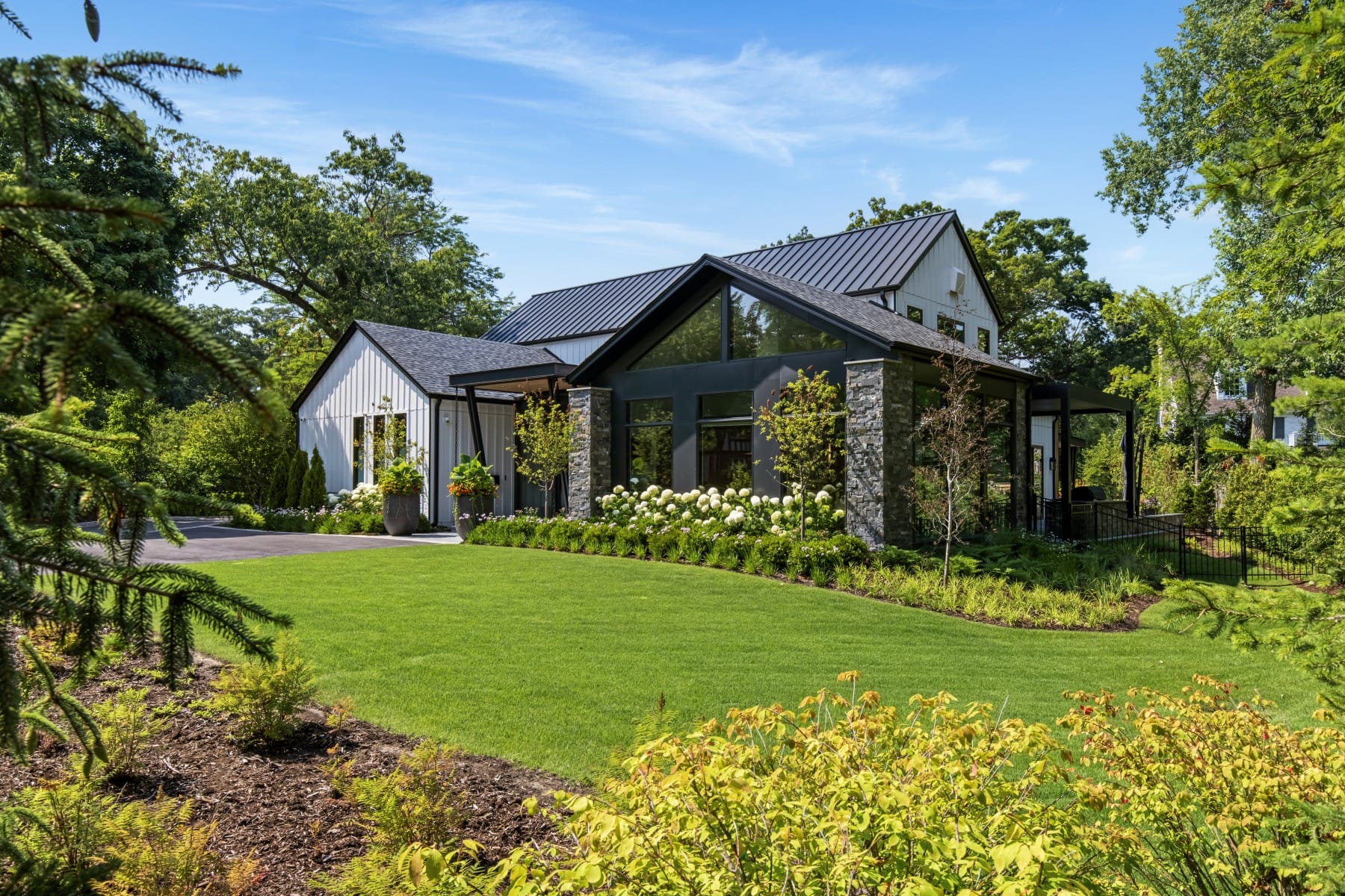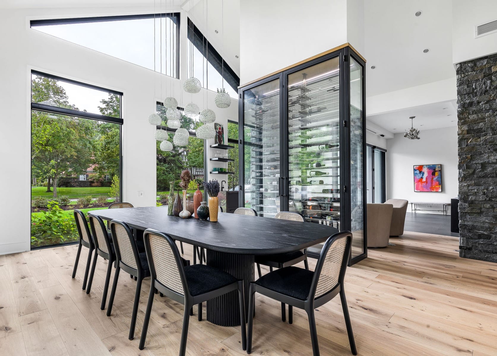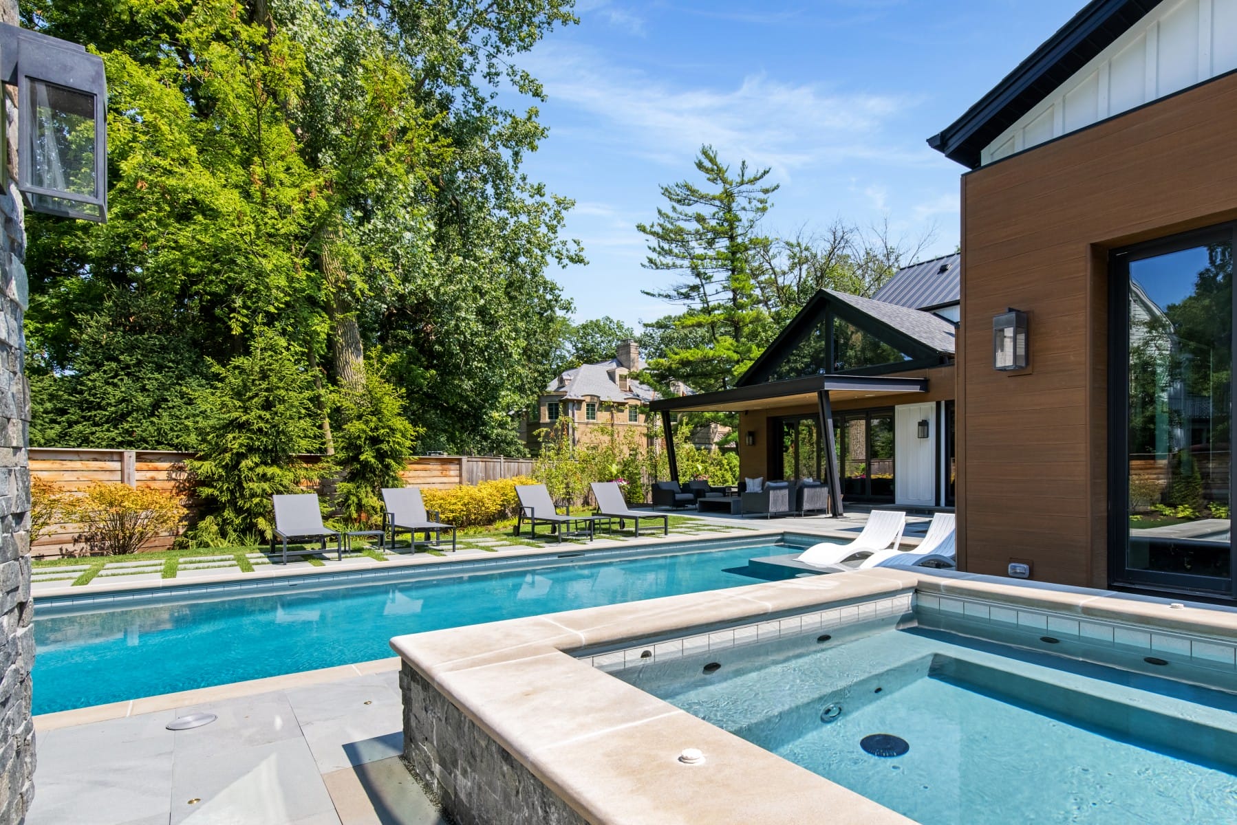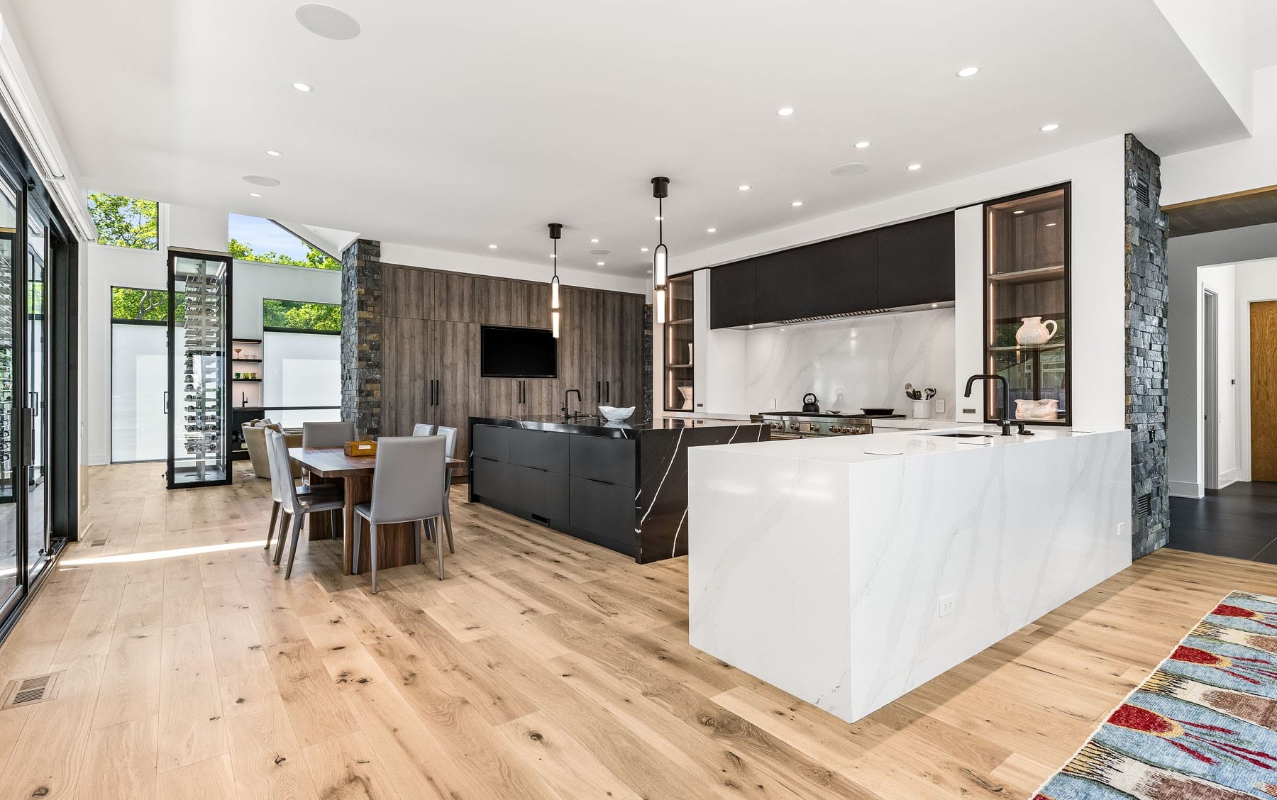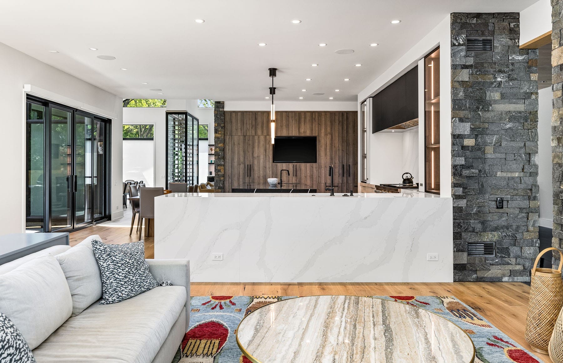 • Dynamic Exterior Design: Layering different exterior blends such as stone, metal panels, board and batten, rain screen composite wood sidings, and teak wood provides a fascinating visual depth to the structure. The incorporation of East Coast natural stone both outside and inside the home, alongside custom metal panels, seamlessly juxtaposes contemporary flair against traditional stone aesthetics.