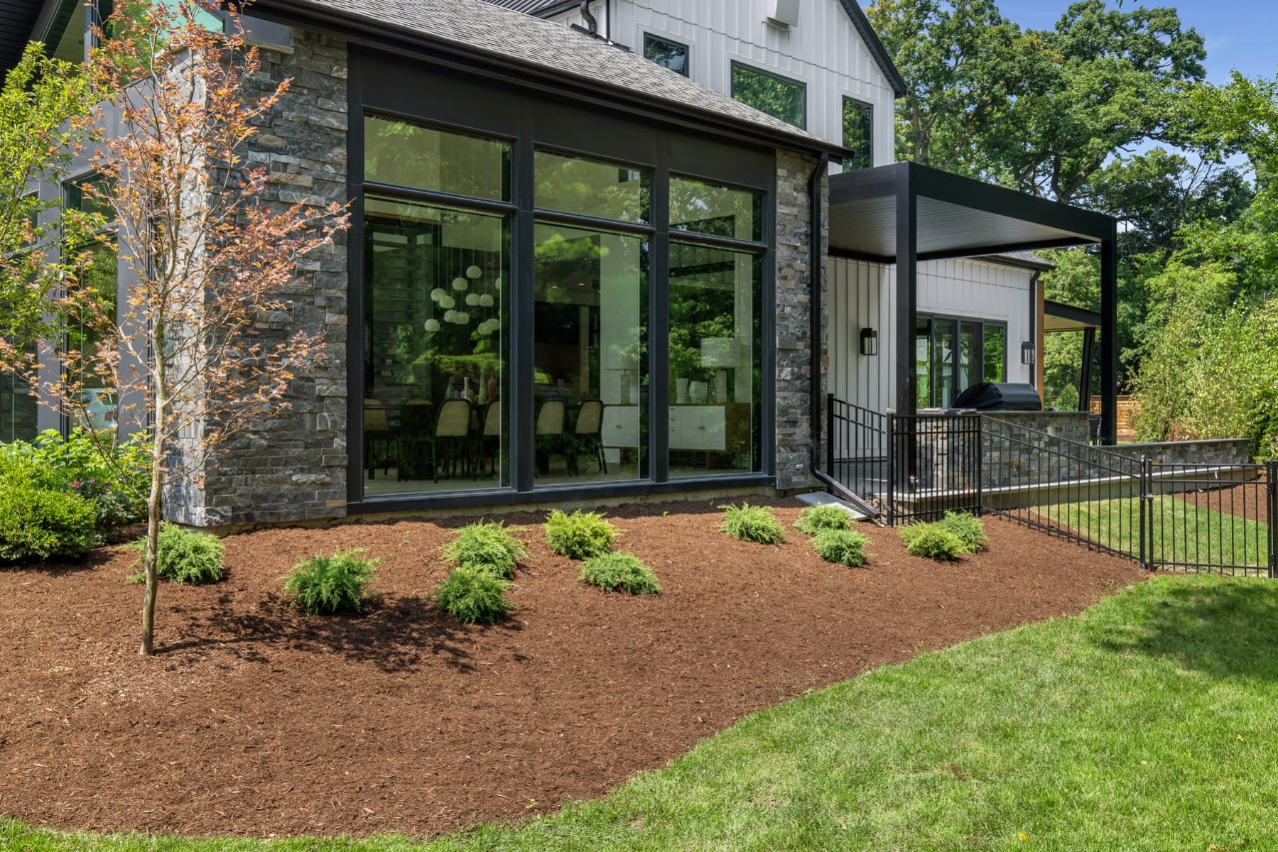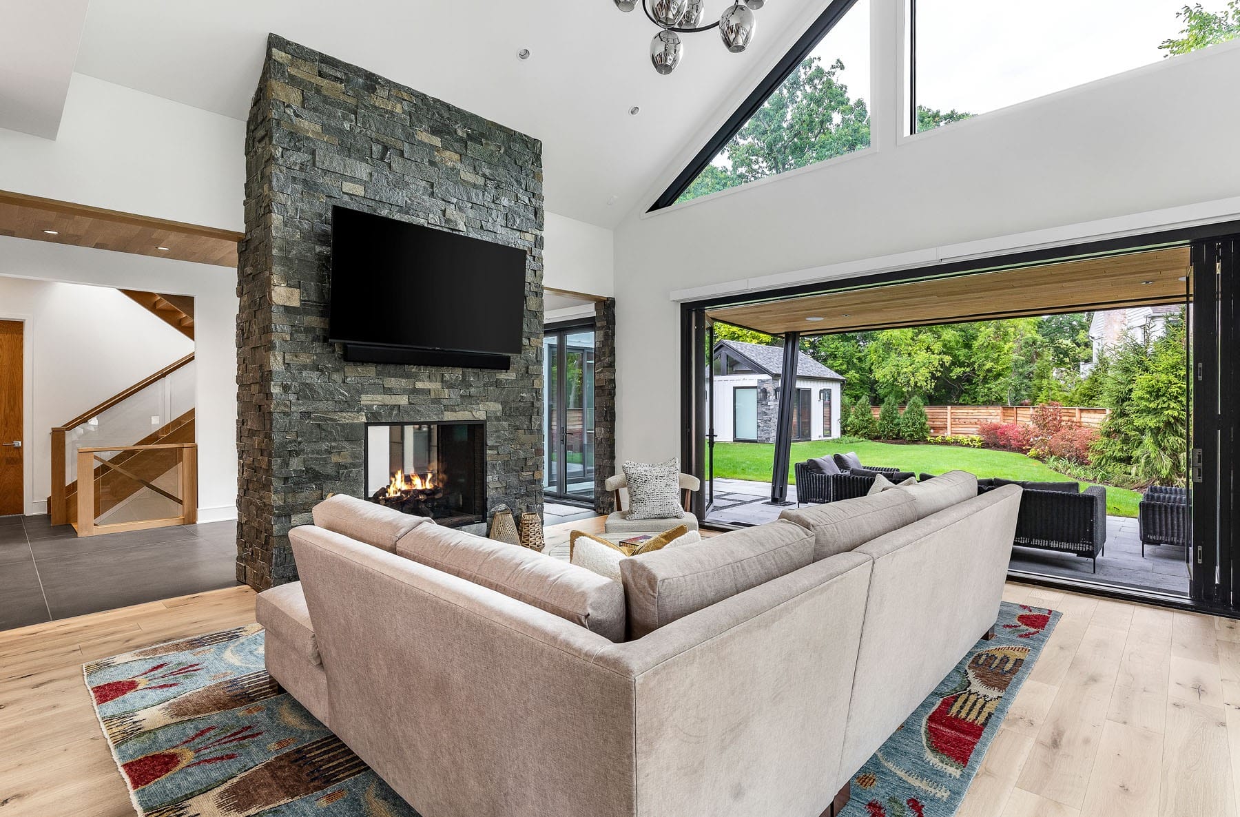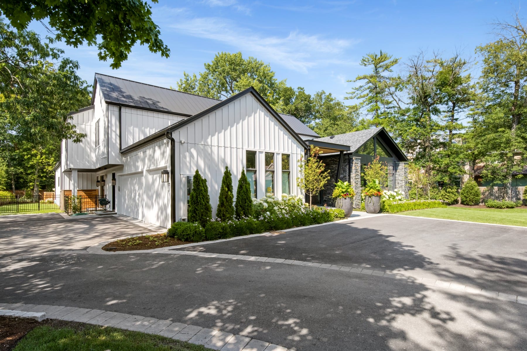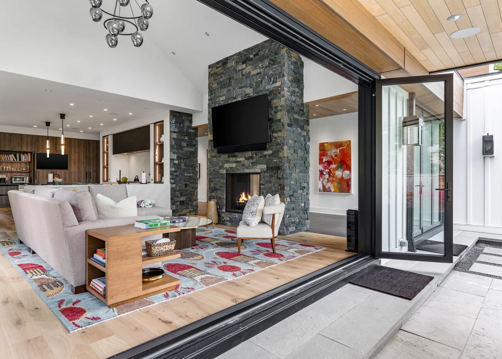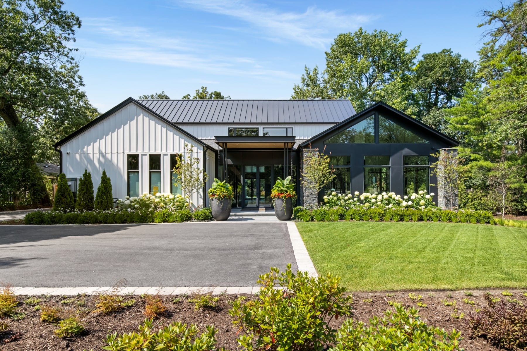 • Dynamic Exterior Design: Layering different exterior blends such as stone, metal panels, board and batten, rain screen composite wood sidings, and teak wood provides a fascinating visual depth to the structure. The incorporation of East Coast natural stone both outside and inside the home, alongside custom metal panels, seamlessly juxtaposes contemporary flair against traditional stone aesthetics.