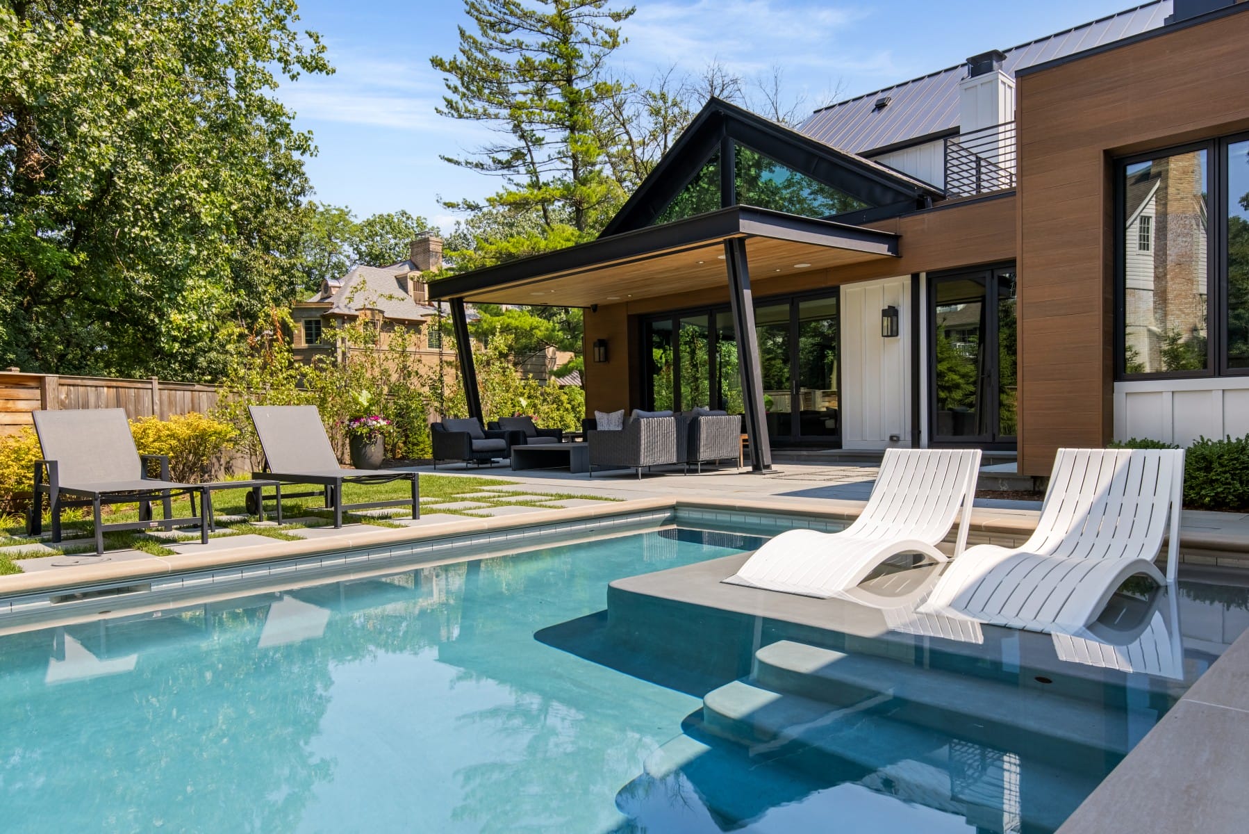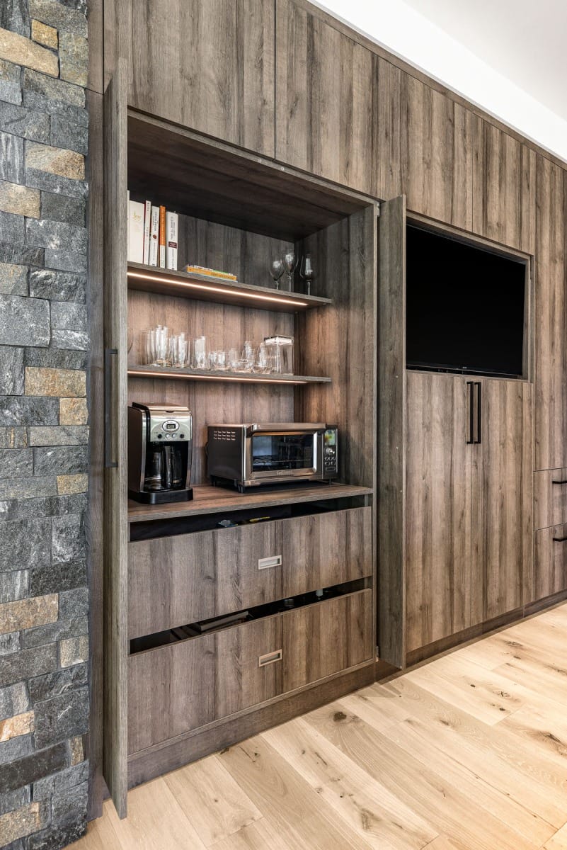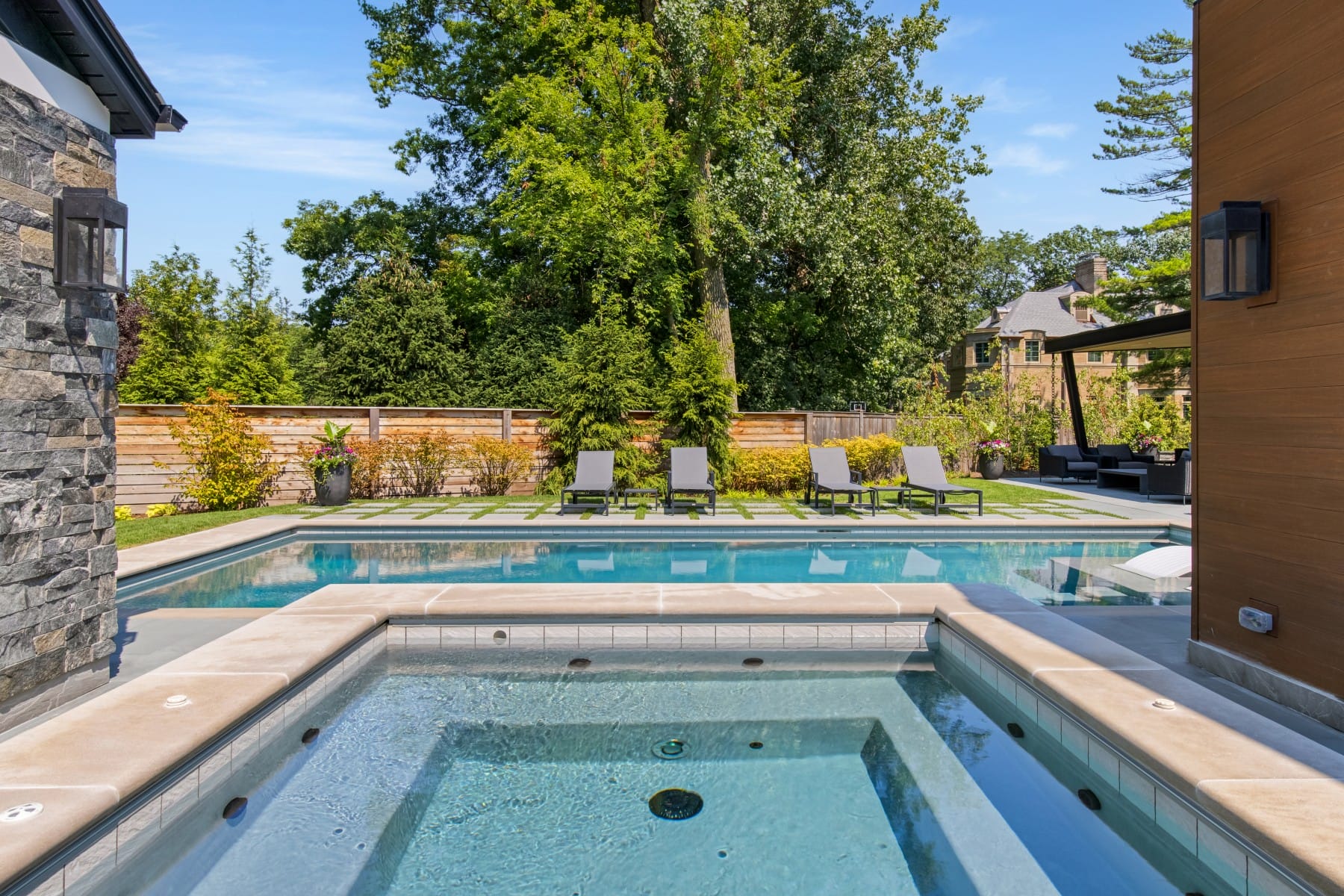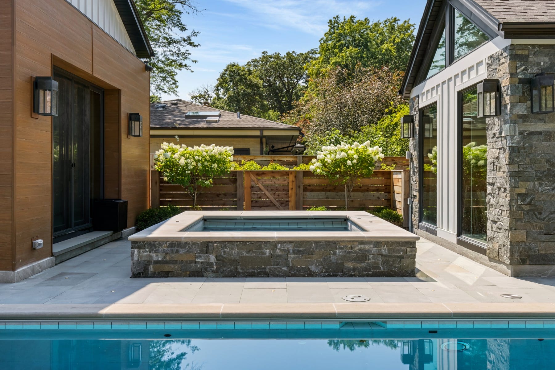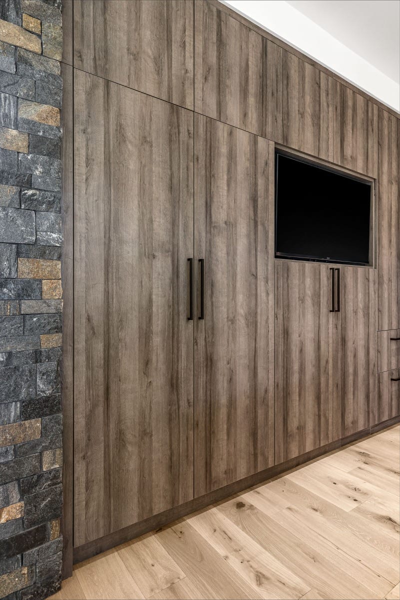 • Dynamic Exterior Design: Layering different exterior blends such as stone, metal panels, board and batten, rain screen composite wood sidings, and teak wood provides a fascinating visual depth to the structure. The incorporation of East Coast natural stone both outside and inside the home, alongside custom metal panels, seamlessly juxtaposes contemporary flair against traditional stone aesthetics.