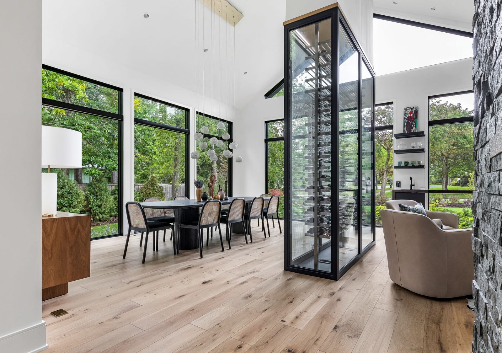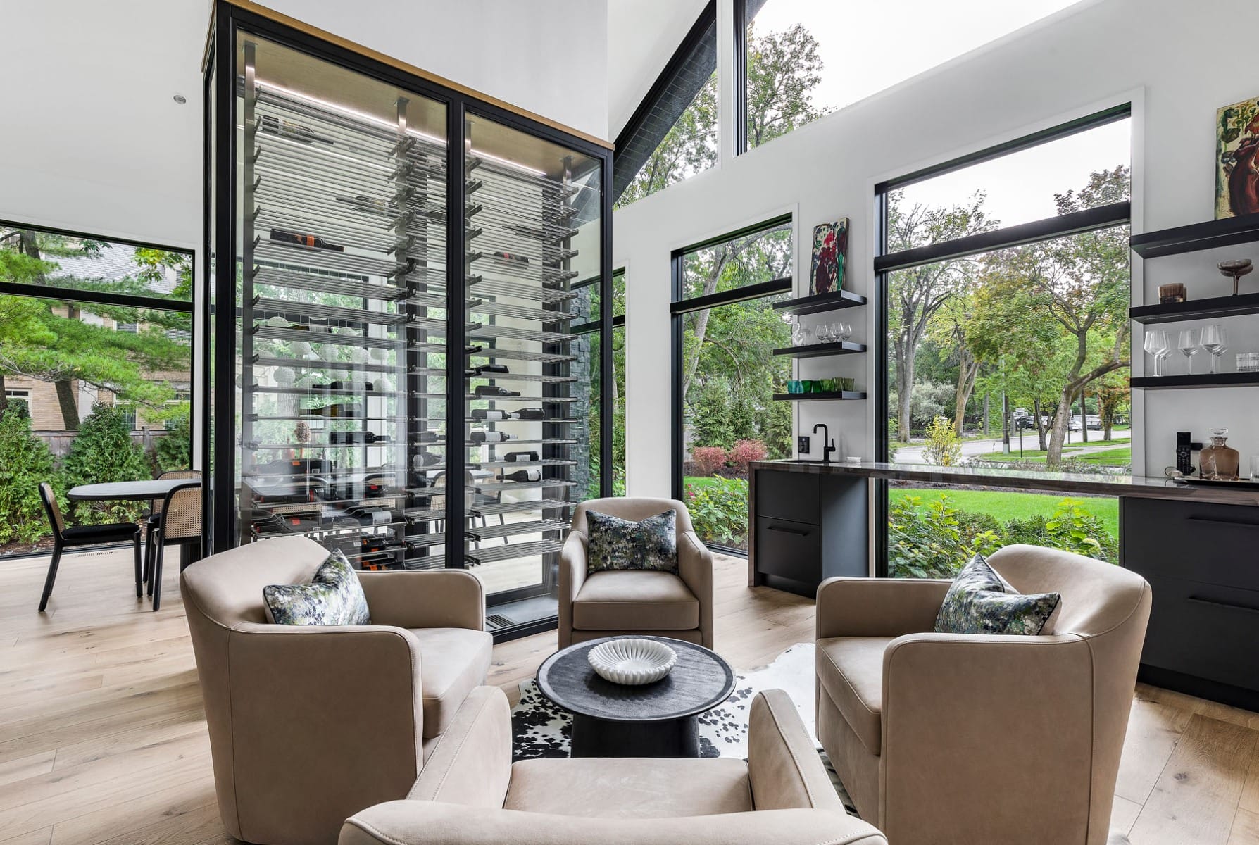 A home that effortlessly blends the contemporary allure with traditional Pennsylvania stone aesthetics, boasting multifunctional spaces and unique design elements. Essential to the client’s vision was an abode that offers surprises at every turn, with areas that unfold as one traverses the property. Additionally, they aspired for unobstructed, beautiful views from every vantage point and specialized spaces including a freestanding painting studio, 4-sided glass wine cellar statement, a dedicated home theater, and bespoke areas for relaxation and recreation.