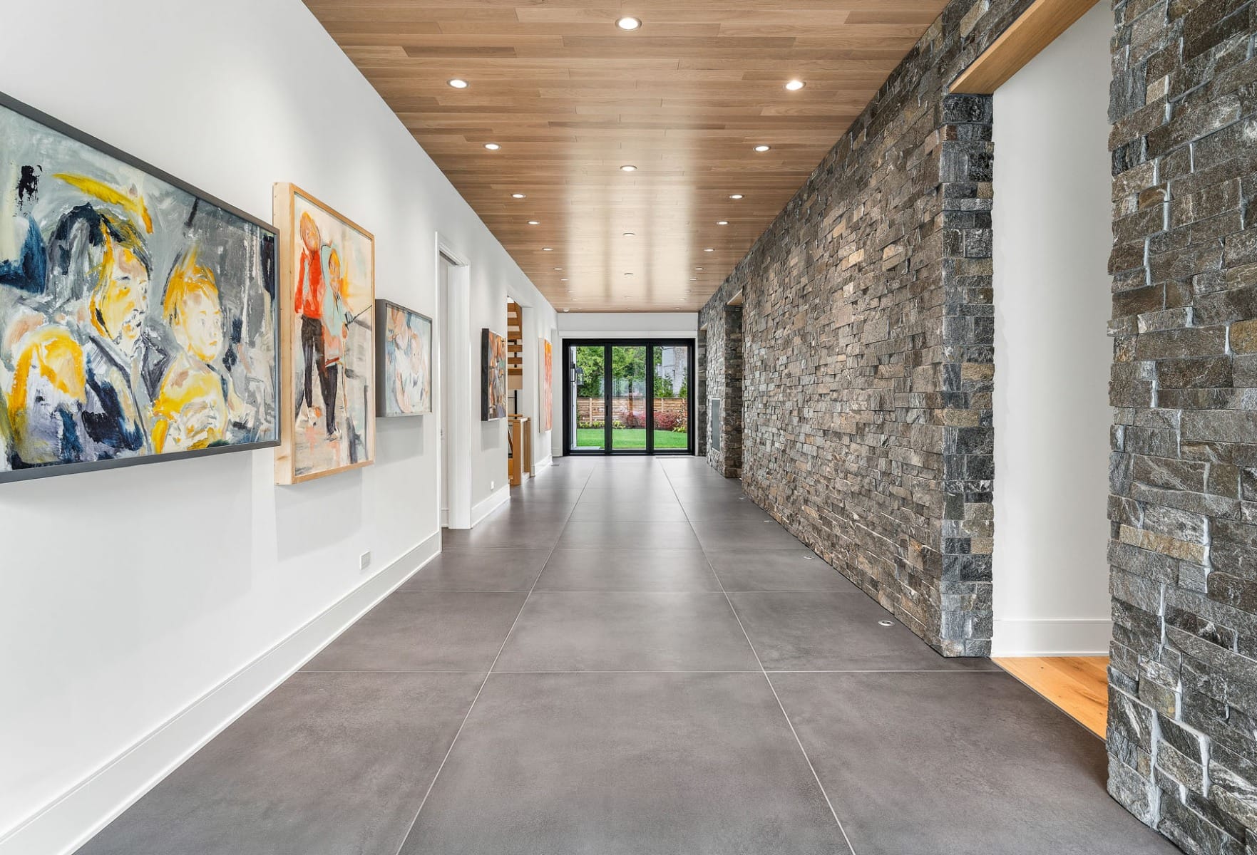 • Dramatic Entrance: The stunning 12 × 50 foot gallery flows through the entryway with wood paneled ceiling and granite stone accent wall, elevated further by an intersecting glass bridge that adds a touch of modern elegance.